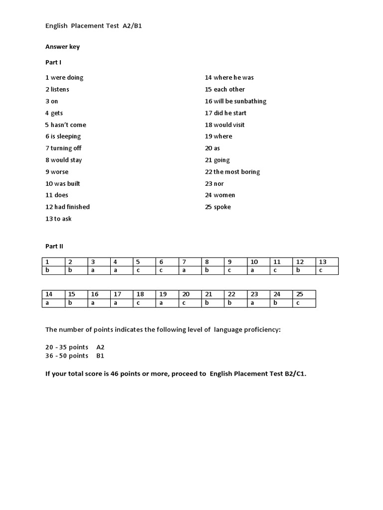 Placement Test A2 B1 Answer Key Pdf